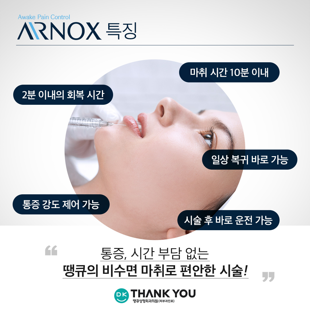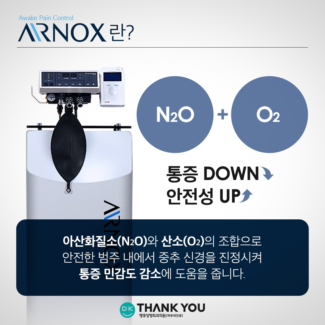 수면 마취 시 겪었던 불편함, 부담감을 덜어드리고자 땡큐에서 도입한 에어녹스는 아래와 같은 특징을 가지고 있습니다. ✔ 10분 이내의 마취 시간 ✔ 통증 강도 제어 가능 ✔ 2분 이내의 회복 시간 ✔ 시술 후 바로 운전 가능 ✔ 일상 복귀 바로 가능 마취와 회복에 소요되는 시간이 길지 않아 시간적 부담이 없으며, 의식이 있는 상태이기 때문에 이에 대한 두려움을 가지신 분들도 부담 없이 편하게 시술을 받아보실 수 있습니다.