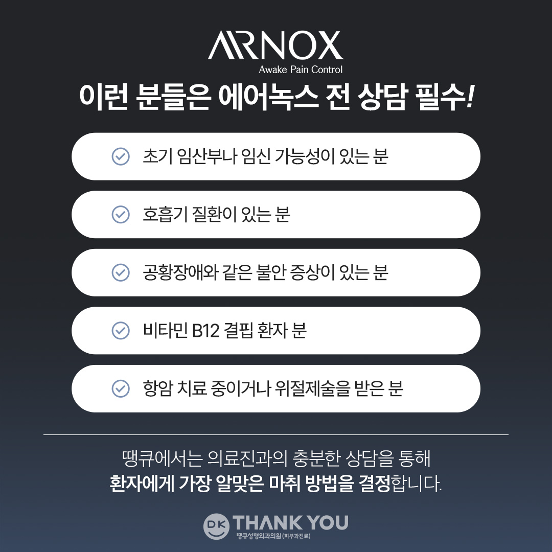 다만, 에어녹스 마취 역시 주의가 필요한 분들이 있기 때문에 담당 의료진과 꼼꼼한 상담은 필수 입니다.